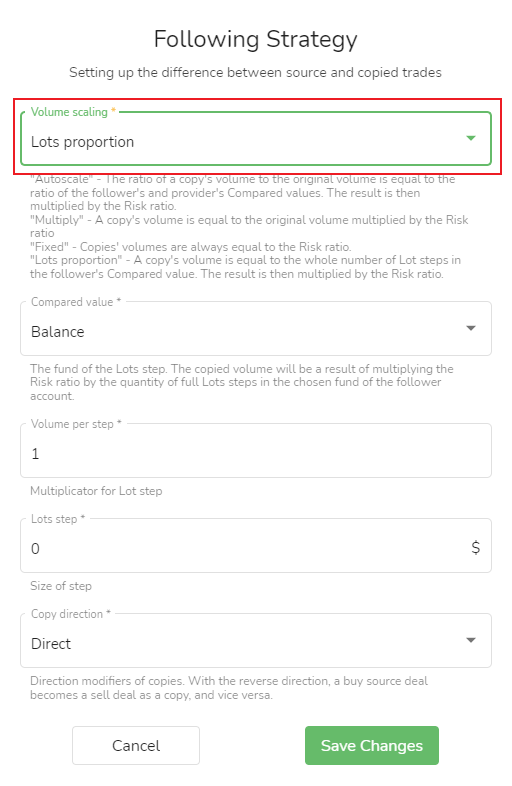 يعتمد حجم تداول النسخ على الرصيد الحالي أو حقوق الملكية لحساب التابع. يمكن للمتابعين تعديل حجم تداول النسخ وفقًا لرصيد الحساب الجاري أو صافي القيمة للتحكم في مخاطر النسخ