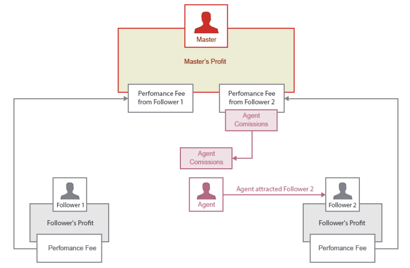 تشير عمولة الوكالة إلى العمولة التي يتم بموجبها تحويل نسبة معينة من "رسوم الأداء" الخاصة بالحساب الرئيسي إلى حساب الوكالة في نهاية فترة التداول، عندما يتم تقسيم الأرباح بين الحساب الرئيسي والمتابعين. يتم تحديد حجم عمولة الوكيل (معبرًا عنها كنسبة مئوية) بواسطة الحساب الرئيسي.
