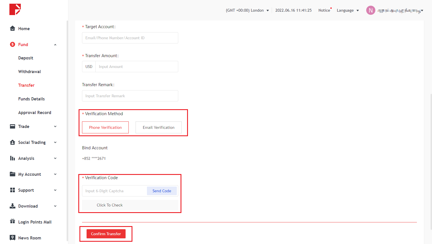Select the transfer-out account, enter the transfer-in account number then the transfer amount. We will be conducting security verification of the transaction via mobile phone or email, click “Send Verification Code” and enter the verification code. Click “Confirm Transfer” at last.