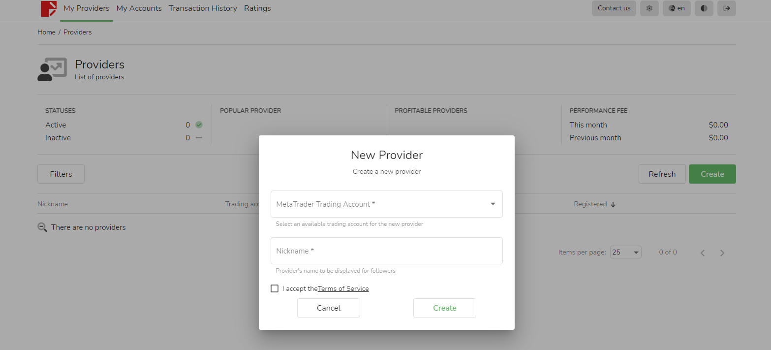 On the [My Account] page of the signal source, you can add a new trading account by clicking the green [Create] button. However, this account cannot be used to log in, and can only be selected as a signal source, follower or set up to receive performance fees.