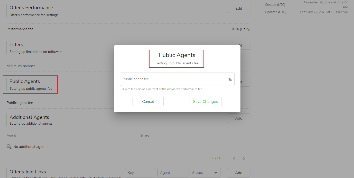 The introducer is responsible for promoting the signal source and attracting followers to subscribe. The signal source needs to pay the promotion fee to the promoter who successfully attracts followers to subscribe. Introductory promotion fees are directly dependent on subscription performance. The signal source can set the referral promotion fee as a percentage for a copying condition, and once set, it is applicable to all promoters.