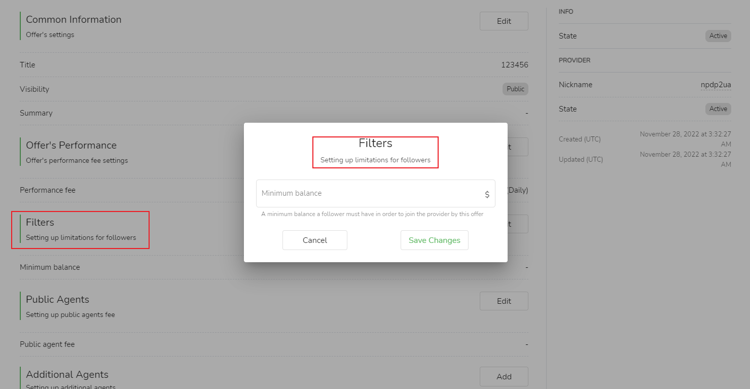 Presentar y promover:La fuente de la señal puede establecer una tarifa de presentación y promoción, que se paga en forma de porcentaje. Tenga en cuenta que el enlace de unión de la fuente de señal a continuación solo se puede agregar después de completar la configuración de la tasa de pago de la tarifa de promoción específica.
