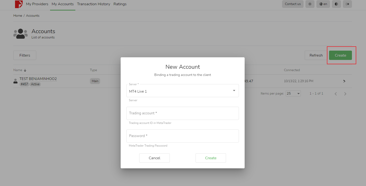 En la página [Mi cuenta] de la fuente de la señal, puede agregar una nueva cuenta comercial haciendo clic en el botón verde [Crear]. Sin embargo, esta cuenta no se puede utilizar para iniciar sesión y solo se puede seleccionar como fuente de señal, seguidor o configurada para recibir tarifas de rendimiento.