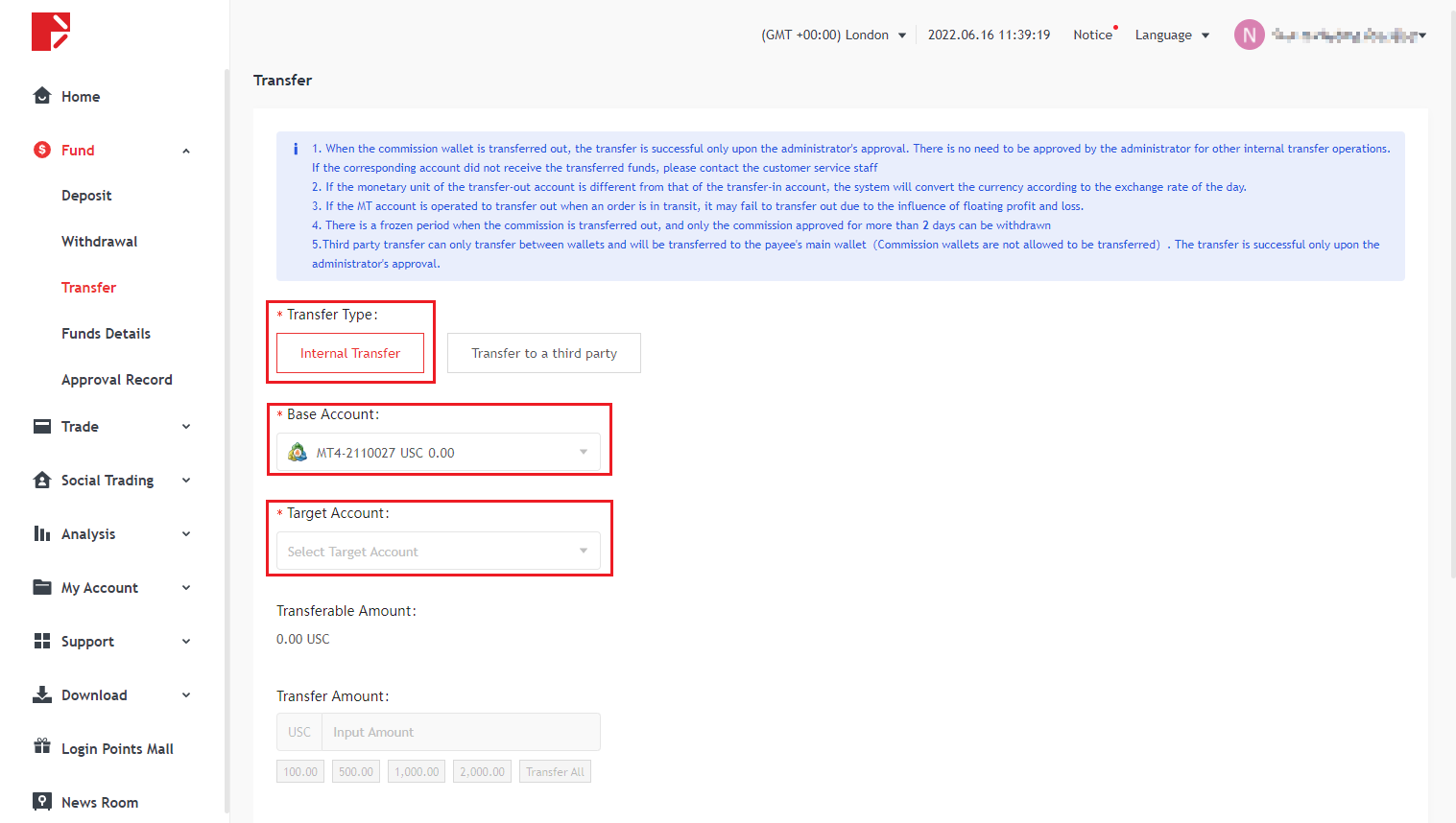 두프라임은 "내부이체"와 "타사이체" 두 가지 이체 방법을 제공합니다.