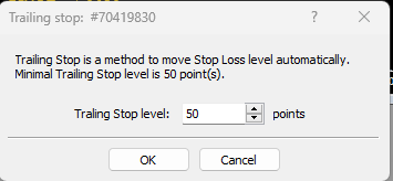 예를 들어 EURUSD 롱 주문에 대해 1랏의 시가가 1.00000인 경우 추적 손절매를 100포인트로 설정하면 유로 가격이 1.00100을 돌파하면 추적 손절매가 발동됩니다. 유로가 1.00100으로 떨어지면 주문은 1.00100 구현에서 중지됩니다.