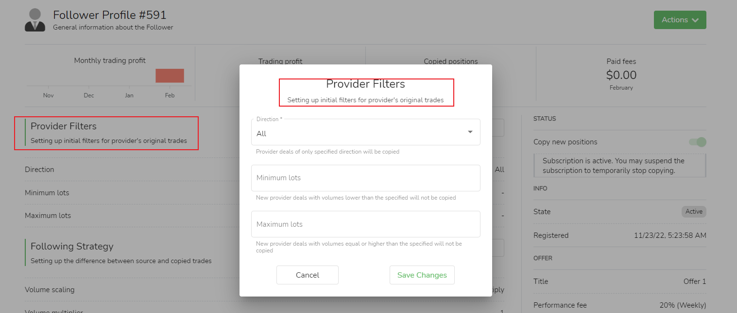 Seguidores podem definir condições de filtro para transações a seguir.