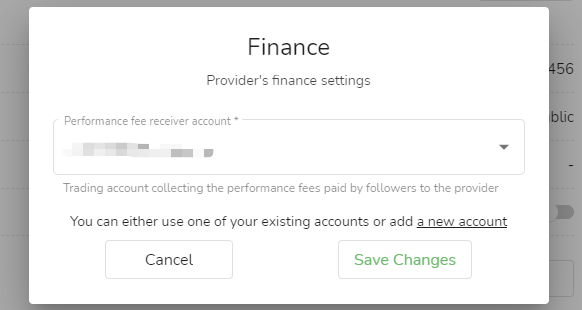 2. Na janela pop-up, selecione a conta que deseja receber a taxa de desempenho e clique em "Salvar alterações".