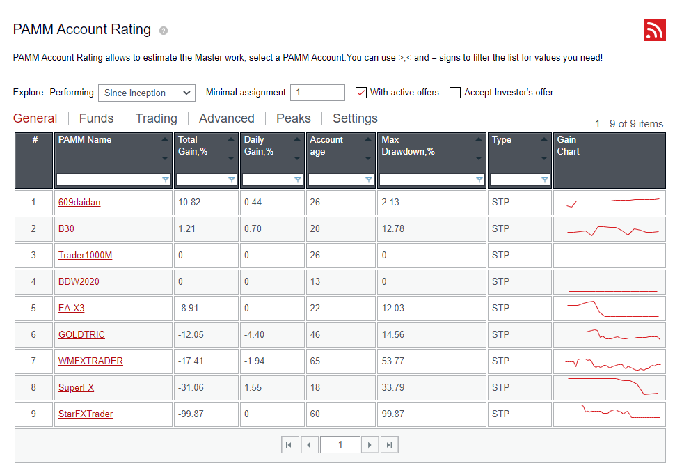 a. Faça login no site PAMM e clique em "Contas PAMM" no menu principal para visualizar as contas PAMM disponíveis (clique apenas em "Ofertas Ativas" para visualizar uma lista de contas PAMM com ofertas ativas):