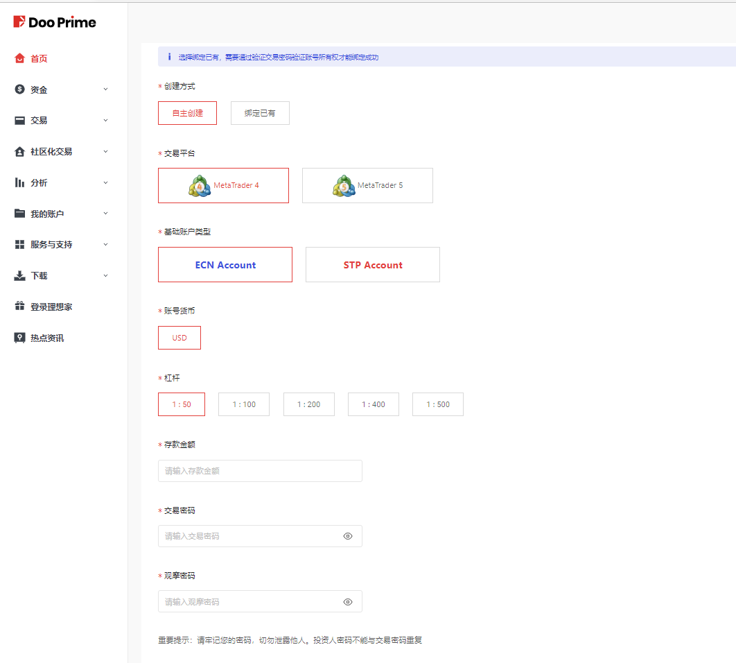 3.2 创建方式可以选择「自主创建」后,设置「交易平台」 ,「基础帐号类型」 ,「账号货币」,「杠杆」,「存款金额」然后设置「交易密码」,「观摩密码」。