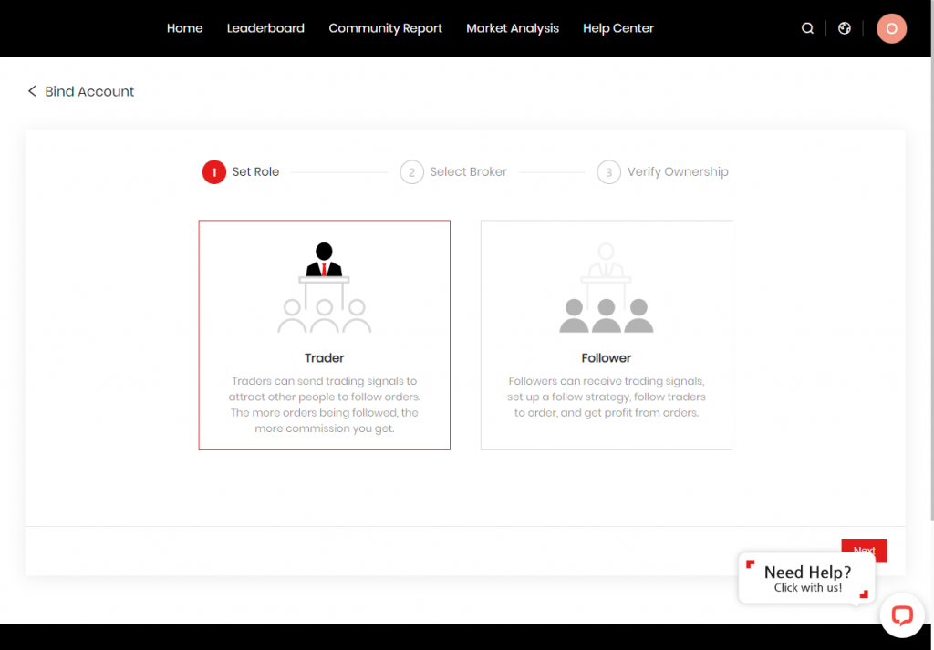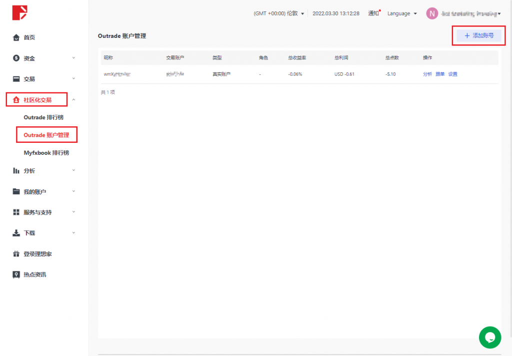 登录您的 Doo Prime 用戶中心,在主页左侧点击「社区化交易」,点击「Outrade 账户管理」,在页面右边点击添加账户,选中「交易者」或「跟随者」角色,最后绑定账户即可。