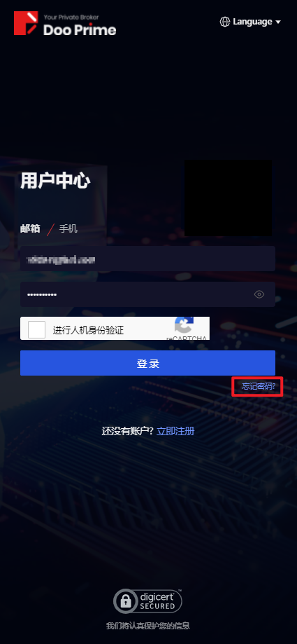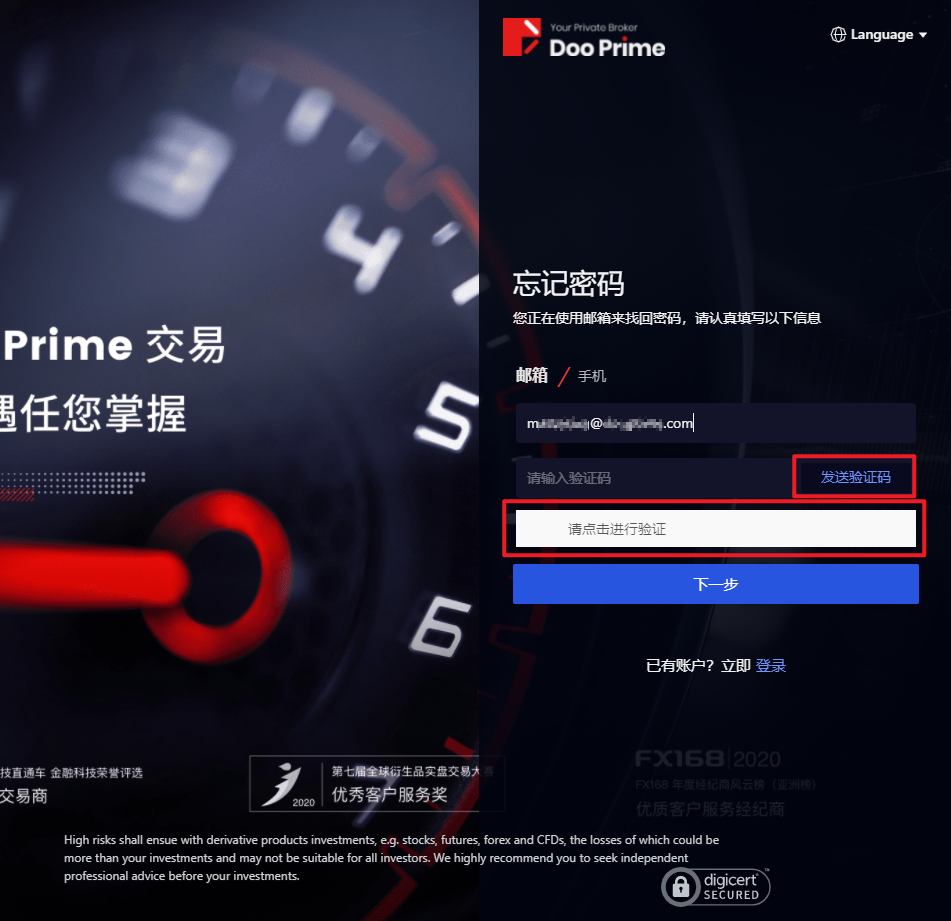 3. 頁面會跳至「忘記密碼」介面,重設D Prime 用戶中心的帳號密碼,點選「下一步」。