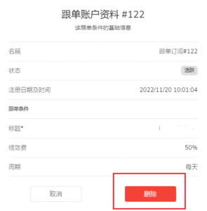 在信號源資料和訂單分配頁面底部,可查看跟隨者列表,並可以通過點擊跟隨者右側的箭頭選擇刪除跟隨者。