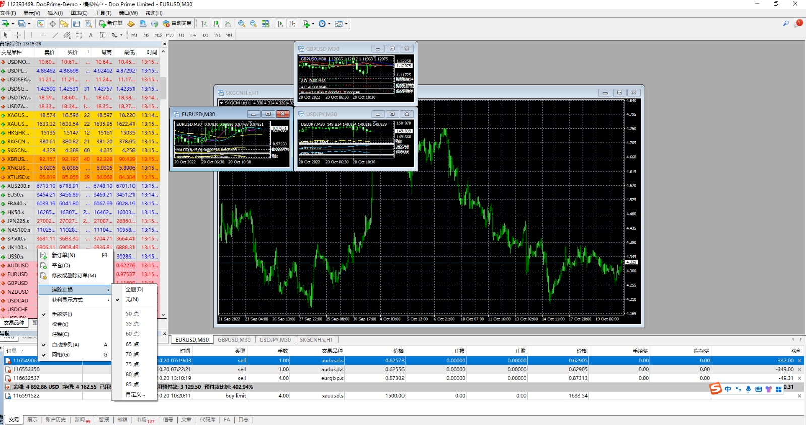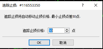 請在終端欄中點擊「交易」查看現有訂單,之後右鍵選中持有訂單,點擊「追踪止損」後選擇「自定義」,填寫您所需設置的追踪止損點數。