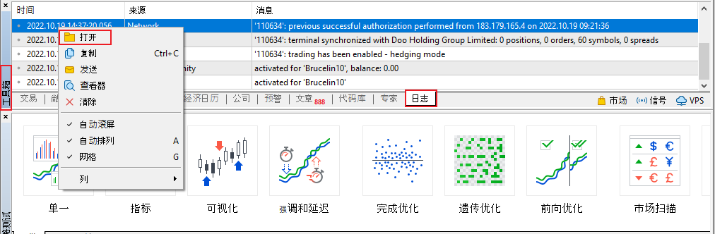 請您登錄MT4 後在底部菜單欄右鍵點擊「日誌」後選擇「打開」,您便可以自行保存選中的交易日誌。