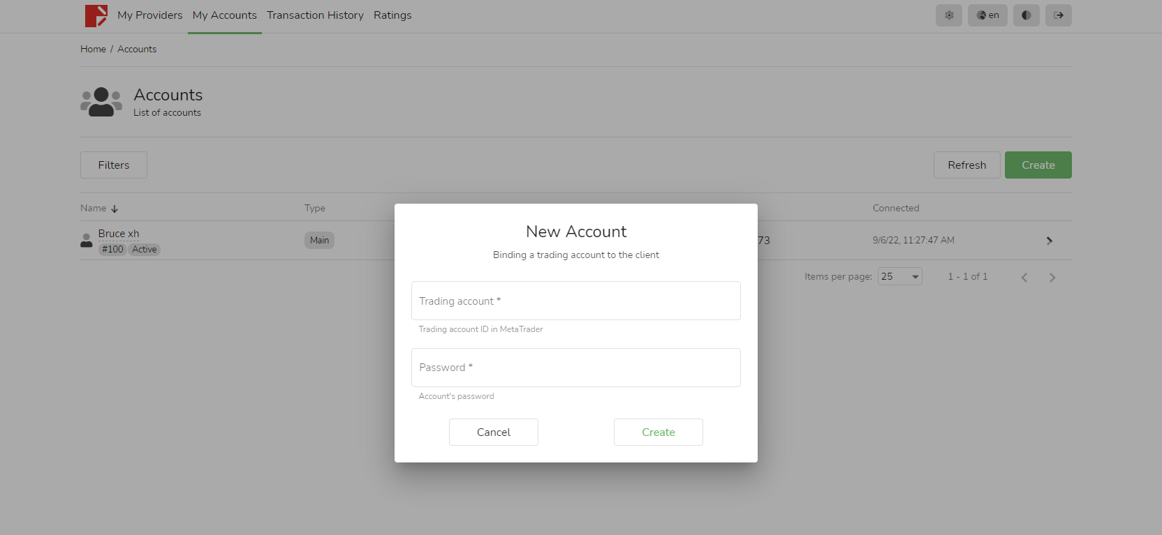 1. Bạn có thể đăng nhập vào CopyTrading, trong cột "Tài khoản của tôi", nhấp vào nút màu xanh lá cây "Tạo" ở bên phải.