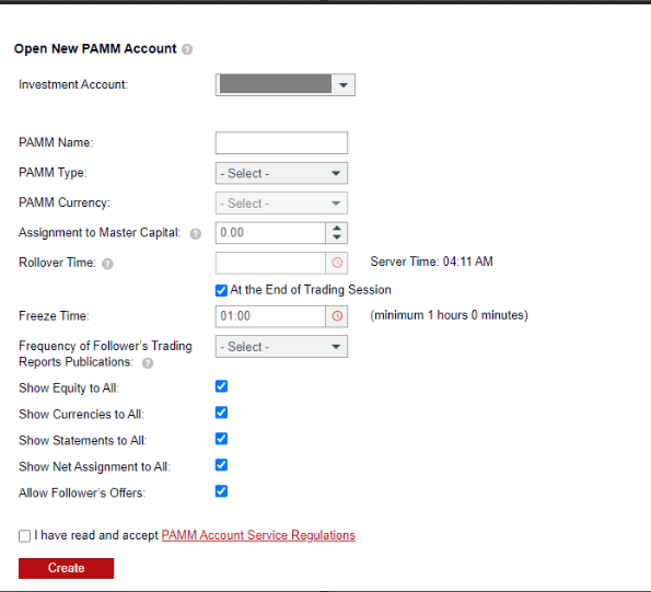 d. Điền các chi tiết sau cho tài khoản PAMM mới của bạn và nhấp vào Tạo. Đảm bảo bạn đã đọc và đánh dấu vào ô đồng ý với các điều khoản và điều kiện.